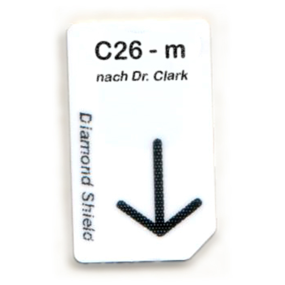 Hulda Clark chipkaart C26 voor behandeling van besmettingen van huisdieren met een Diamond Shield zapper. Doel van de frequenties is het bestrijden van: